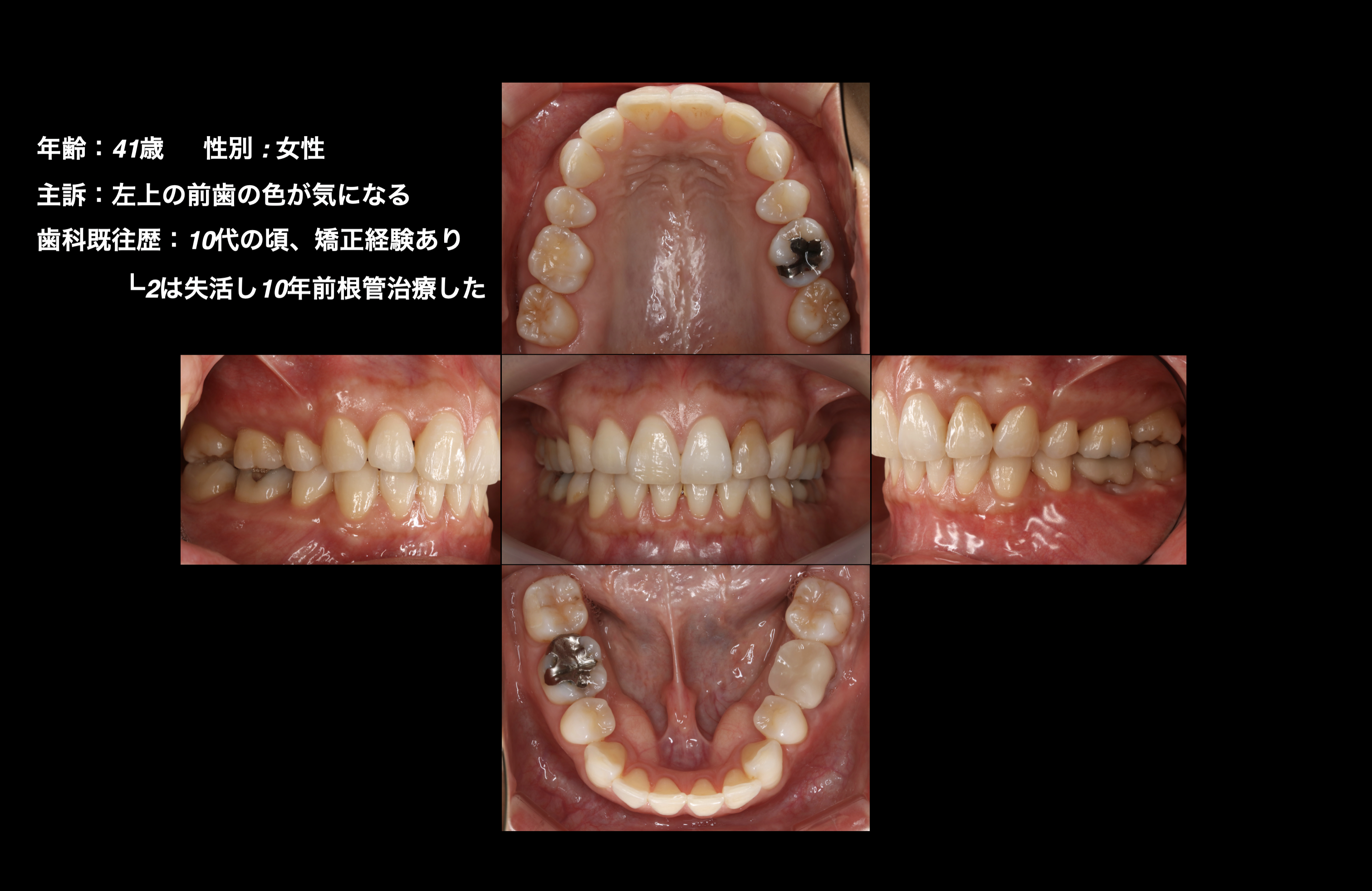 患者様は、左上の前歯の変色を主訴に当院受診されました。歯科的既往歴として、10代の頃に矯正を経験されています。